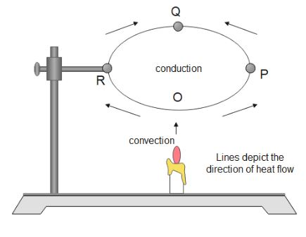 Note: Convection is the transfer of heat through fluid medium (through air here) and conduction is the transfer of heat through a solid medium. Here, the heat from the candle to the loop is transferred through convection. Then, the transfer of heat from one point of the metal loop to another is through conduction.