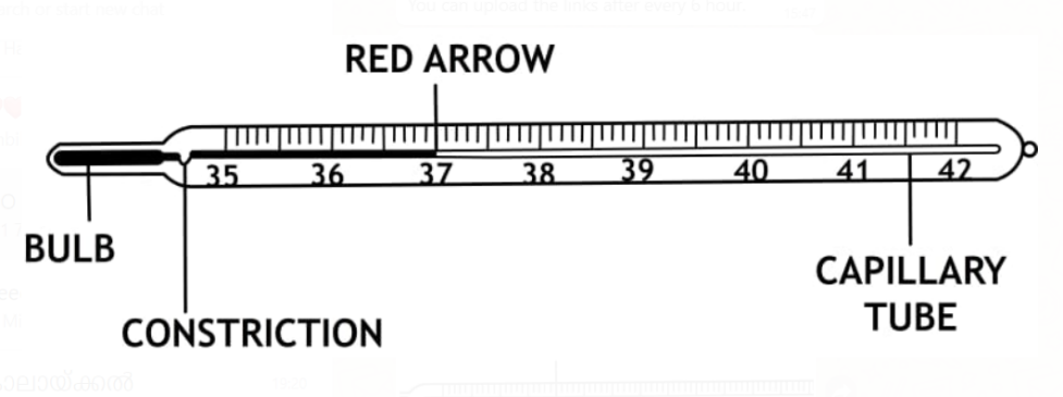 There is a slight bend in the stem above the bulb, this bend is called the constriction. It is this constriction that prevents the mercury from falling back. The normal temperature of a healthy person is 37 degree Celsius. This reading is marked by a red Arrow in the thermometer.