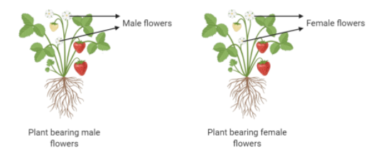 Dioecious – When the male and the female flowers are present on the different plant bodies, then it is known as the dioecious plant. Examples – Date palm, Papaya, etc.