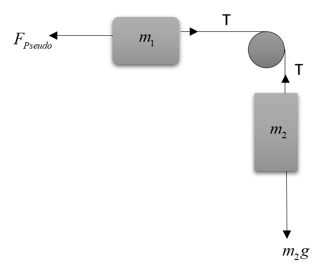Note: It must be noted that we’ve taken only contributing forces while making free body diagrams as showing all forces will create unnecessary calculations and confusions. On both the blocks, the weight is acting. But we’ve shown only the weight of $m_2$ as only it will contribute to the motion of blocks. Similarly pseudo force is acting on both the blocks, but we’ve shown it only for the upper block. In case friction, we have to take each and every force including normal reactions, contact forces, etc. and then analyze the situation properly.