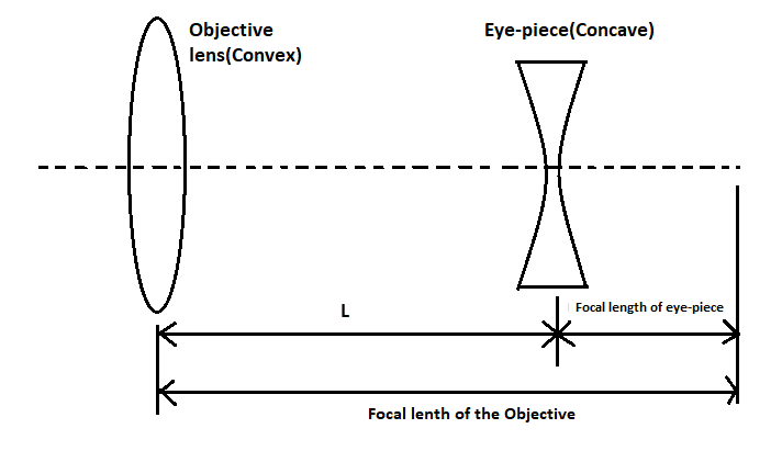 As we can see in the above figure, the objective is a convex lens and the eye-piece is a concave lens.