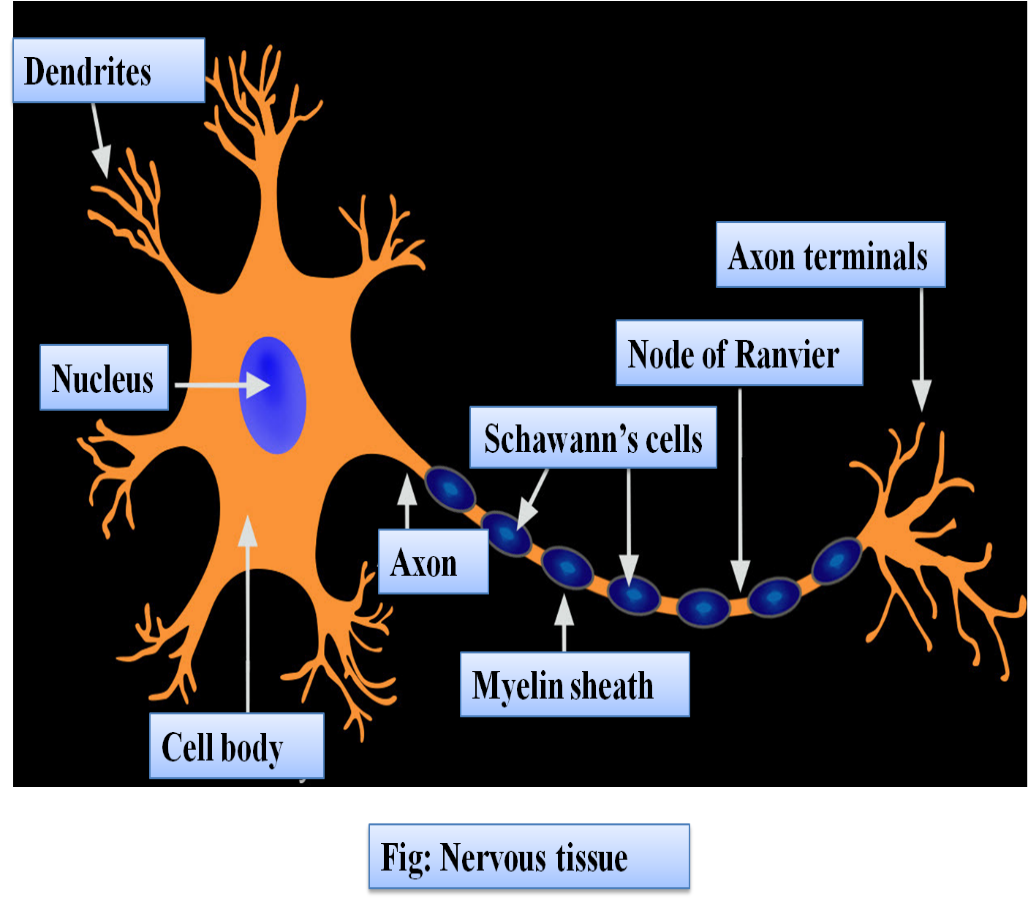 The nervous system consists of special cells called nerve cells or neurons. Cyton is the main cell body which provides many processes called dendrites. A long fiber-like process coming out of the cyton of a nerve cell is named the axon of the nerve fiber. An axon is an extended, slender projection of a neuron, or neuron, in vertebrates, that typically conducts electrical impulses referred to as action potentials far away from the neuron body. The function of the axon is to carry information to different neurons, muscles, and glands.