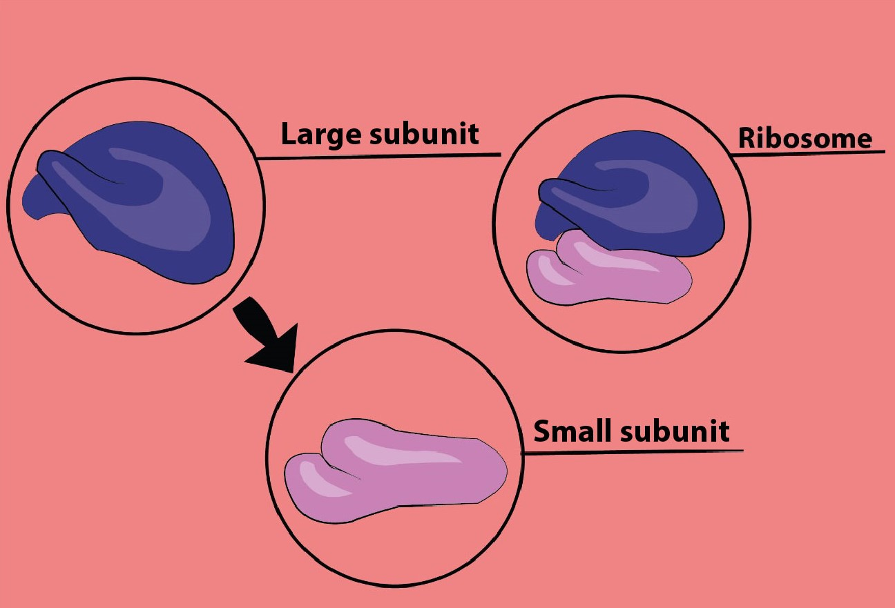 The ribosomes are composed of two subunits. One ribosomal subunit is large and has a dome-like shape, while the other ribosomal subunit is smaller in size and occurs above the larger subunit and forms a cap- like structure.