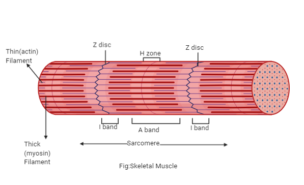 Complete answer: Electron micrographs of groups of filaments aligned with their axes parallel to the length of the fibres reveal thin sections of muscle fibres. There are two types of filaments; thick and thin filaments. There is a light band of low density called the I band in a longitudinal section through a group of myofibrils. There is a prominent dense line called the Z line in the centre of the I band, but in fact, given the myofibril's three-dimensional structure, it is more fitting to speak of Z discs. The primary structural and functional unit is directly responsible for muscle contraction and can be assumed to be the region between two Z lines. Thus, myofibril can be seen as a stack of sarcomeres. The A-band appears black, comprising thick filaments that are partially overlapped with thin filaments.