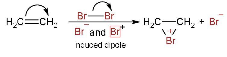 The reaction between alkene and bromine water is an example of electrophilic addition. Bromine has ionic properties: $\left( \text{B}{{\text{r}}^{-}} \right)$. Due to this property the bromine induces charges in pi-bond also. Let us see the mechanism of this reaction to understand this reaction completely: