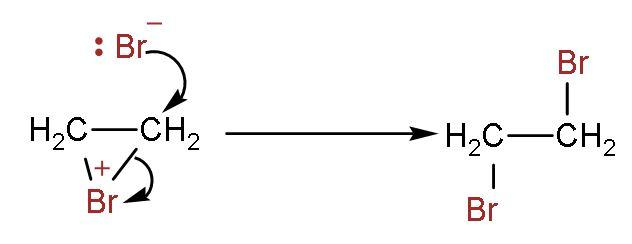 Step (3)- It attaches to other double bonded carbon, and thus the product is formed. The two bromine atoms are attached to both carbon atoms containing double bonds.