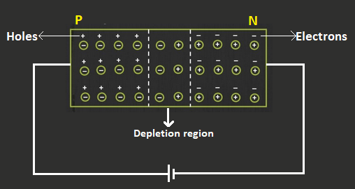 During the forward bias condition, the holes in the p-side will move from p-side to the n-side and the electrons in the n-side will move from n-side to p-side.