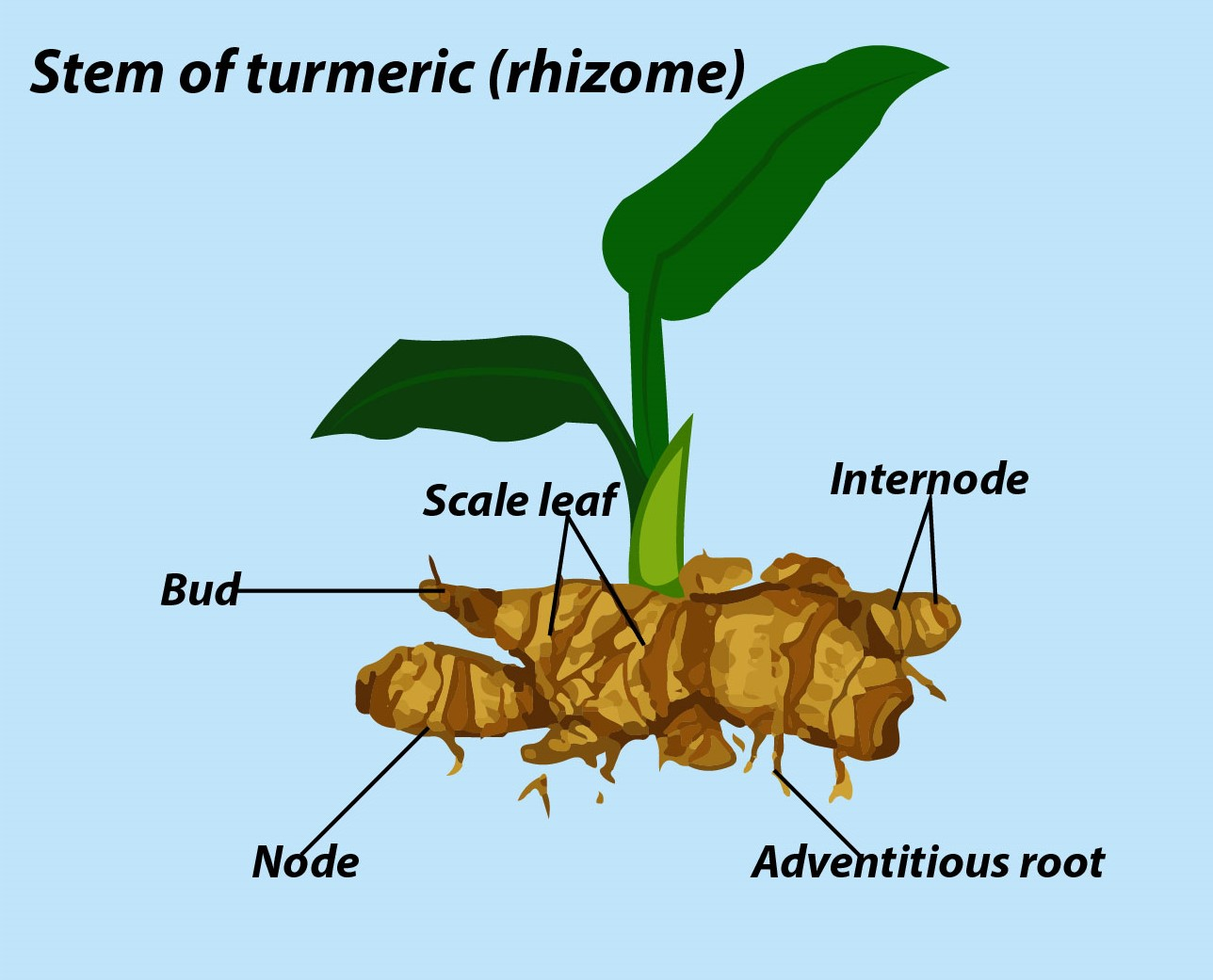 - Ginger, turmeric, canna, and banana are examples of rhizomes; water lily is an example of thorns; colocasia, alocasia, and saffron are examples of corm