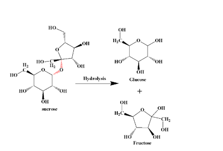 Hydrolysis of sugar results in forming of smaller units which may be polysaccharides, disaccharides or the smallest of all- monosaccharides. A typical hydrolysis reaction is shown below:
