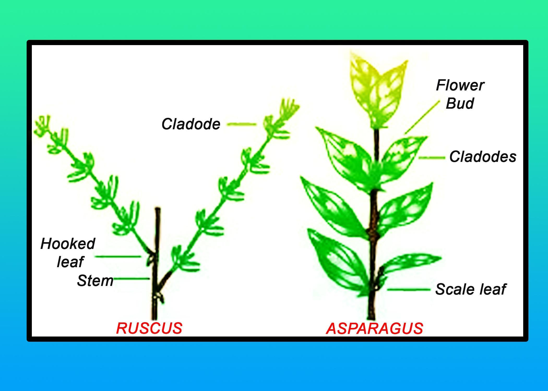 Asparagus species are erect or climbing, and most of the species are more or less woody. The rhizome-like, or sometimes tuberous, roots give rise to conspicuous fernlike branchlets. True leaves are reduced to small scales. Many species are dioecious (individuals are either male or female), and the small greenish-yellow flowers in the spring are followed by red berries in the fall. Members of the genus are characterized by the presence of cladodes, which are leaf-like organs in the axils of the true leaves. Cladode is a modified stem. In this, branches have limited growth. They become green and flat-like leaves. It is a morphological feature of Asparagus.