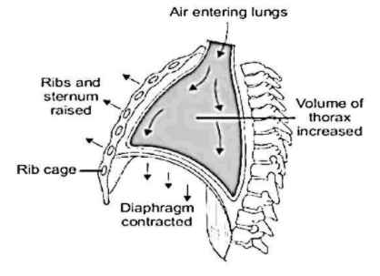 During normal breathing, contraction and relaxation of the external intercostal muscles bring about movement of ribs and sternum. The muscles contract and the ribs and sternum are pulled out. This increases the volume of the lung cavity and as a result the pressure decreases, Thus the movement of air is from high to low i.e. from the atmosphere to the inside. The dome shaped diaphragm is also pulled in such a way that the volume of the lung cavity increases. Thus the diaphragm becomes flat during inspiration