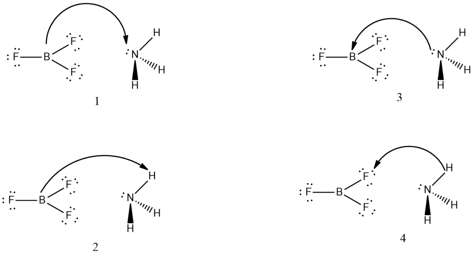 ${ BF }_{ 3 }$ and ${ NH }_{ 3 }$ undergo Lewis acid-base reaction forming an adduct. Which picture below currently represents the curved arrow notation for the initial Lewis acid-base interaction in this reaction, what is the Lewis acid and the Lewis base?