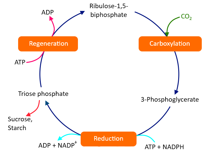 The process of photosynthesis, in higher plants, occurs in two phases – light and dark, and the dark phase or dark reaction is also known as the biosynthetic phase. In general, it can be understood that the first phase is for converting the light energy into chemical energy and this chemical energy is further used in the formation of the desired form of food in the second phase. The events or reactions occurring during the light phase are mainly photolysis and synthesis of ATP and NADPH. As these are directly driven in the presence of light and obtain necessary energy from the sunlight, they are called light reactions, light-dependent phase, or photochemical phase. In the second phase of photosynthesis i.e. the dark phase, the chemical products, ATP and NADPH formed during the light reaction, are used to make glucose in the stroma of the chloroplasts via Calvin Cycle. The reactions are not directly dependent on the presence of light and hence these are called dark reaction, light-independent reaction, or biosynthetic phase. The Calvin cycle has been shown below -