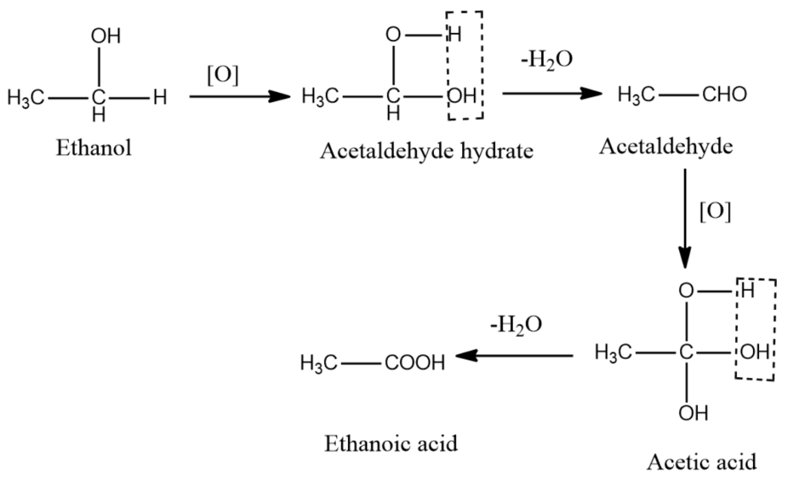 2) Now, ethanol can undergo oxidation on the addition of an oxidizing agent. Alcohol on oxidation first gets converted to Aldehyde which on further oxidation gives carboxylic acid.
