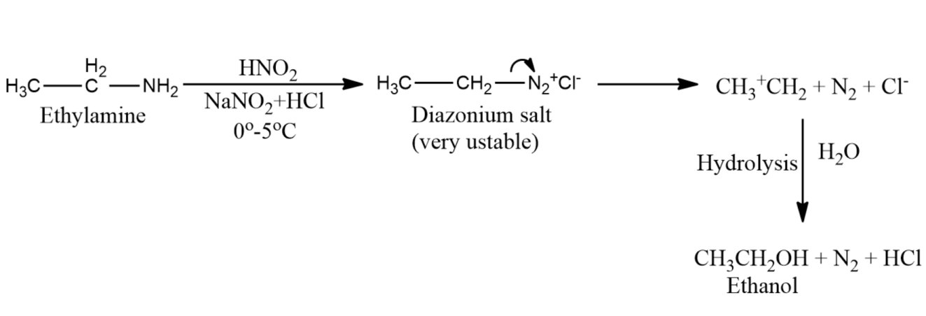 1) When ethylamine reacts with nitrous acid it gets converted to an ethyl diazonium salt. Diazonium salts are unstable. Therefore, ethyl diazonium salts get converted to ethyl alcohol thus liberating nitrogen gas and ethanol. Nitrous acid is prepared by acidifying the aqueous solution of sodium nitrate. Free nitrous acid is not stable and decomposes rapidly. This reaction is therefore done inside the reaction mixture which is known as in situ.