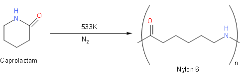 The above reaction is the transformation of monomer caprolactam into polymer Nylon-6. We should know that almost all caprolactam produced goes into the manufacture of Nylon 6. This type of polymerisation is ring-opening polymerization (ROP). We should know that ring-opening polymerization (ROP) is a form of chain-growth polymerization, in which the terminus of a polymer chain attacks cyclic monomers to form a longer polymer.