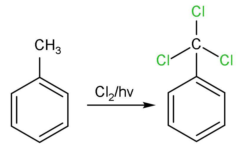 A. Chlorination: In this, light and heat initiates the substitution process by breaking the chlorine molecule $\left( \text{C}{{\text{l}}_{2}} \right)$ into chlorine radicals $\left( \text{C}{{\text{l}}^{\bullet }} \right)$, which further breaks the alkane into radicals and proceeds the reaction forward. This reaction is shown by aliphatic hydrocarbon not by aromatic hydrocarbon. Here, aliphatic is the methyl group attached to benzene of toluene. The reaction replaces all the hydrogen atoms of methyl group $\left( -\text{C}{{\text{H}}_{3}} \right)$ by chlorine atoms $\left( -\text{CC}{{\text{l}}_{3}} \right)$. The reaction is