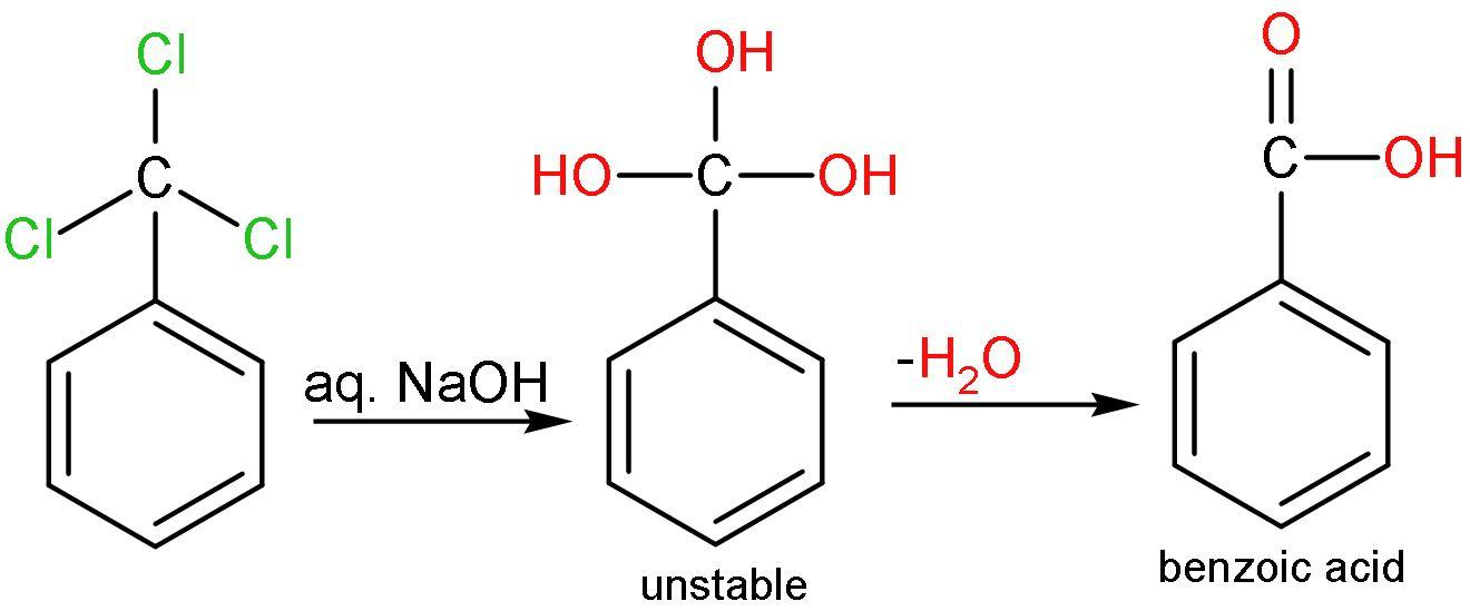 B. Hydrolysis: Hydrolysis is addition of water molecules. The chlorine atoms of $\left( -\text{CC}{{\text{l}}_{3}} \right)$ is replaced by the $\left( -\text{OH} \right)$ groups. All the three chlorine atoms are removed and $\left( -\text{OH} \right)$ group is added. $\left[ -\text{C}{{\left( \text{OH} \right)}_{3}} \right]$ has three $\left( -\text{OH} \right)$ groups, which is very unstable. It is unstable because of the steric hindrance and mainly due to interaction between $\left( -\text{OH} \right)$ groups which lessens the bond angle and repulsions occur. So, the $\left( -\text{OH} \right)$ groups are removed by releasing water and forming carbonyl groups. The reaction is