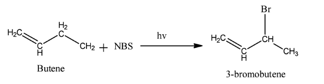 Complete step-by-step solution:We know that reagent used in a chemical reaction is a compound added to the system to cause a chemical reaction. The reagent causes the desired chemical reaction. Here the reagent used is $NBS$ . Its full name is $N - $ bromosuccinimide. It is a substitute for bromine as it gives a low concentration of $B{r_2}$ . It is used as a reagent in allylic bromination. Allylic bromination is the replacement of a hydrogen atom attached to a carbon atom adjacent to a double bond. The reaction occurs in presence of light. An example of this reaction is as follow: