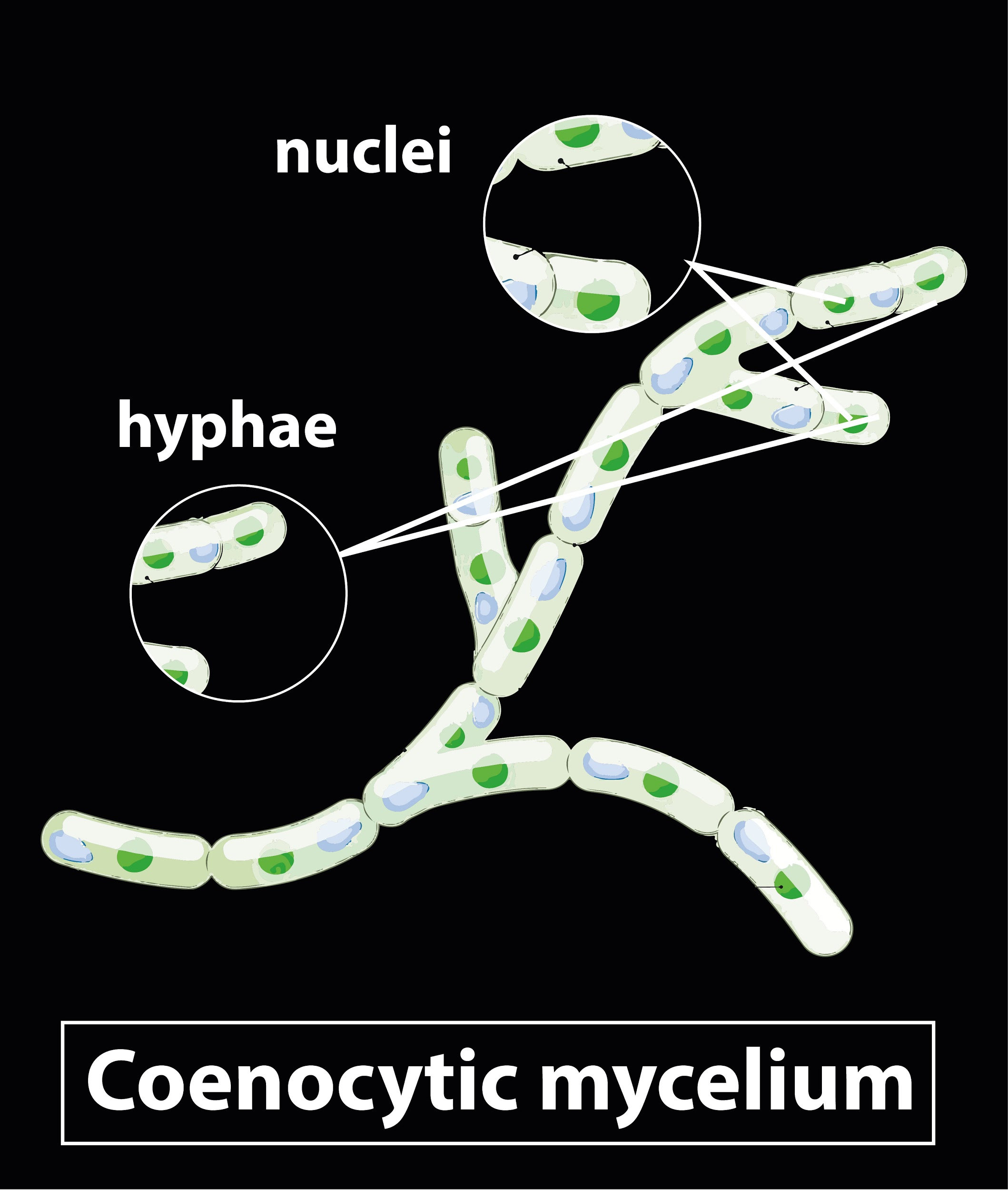 Coenocytic mycelium is found in both Rhizopus and Mucor. Coenocytic hyphae are continuous tubes like structures with multi- nucleated cytoplasm and mycelium is a network of hyphae. Thus we can conclude from the above two statements that a coenocytic mycelium is a network of multinucleated hyphae.