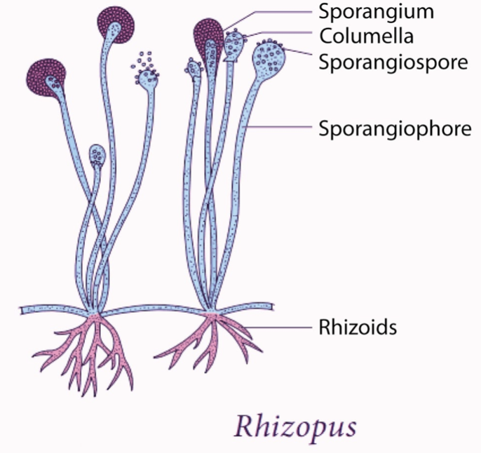 - Rhizopus belongs to the phylum Zygomycota is a filamentous fungus found in soil, decaying fruit and vegetables, animal feces, and old bread. They are common contaminants, also occasional causes of serious infections in humans. The best grow at 45- degree Celsius. The sporangium is spherical in shape and sporangiophore is mostly brown and unbranched. The columella is spherical or elongated. The apophysis is not prominent.