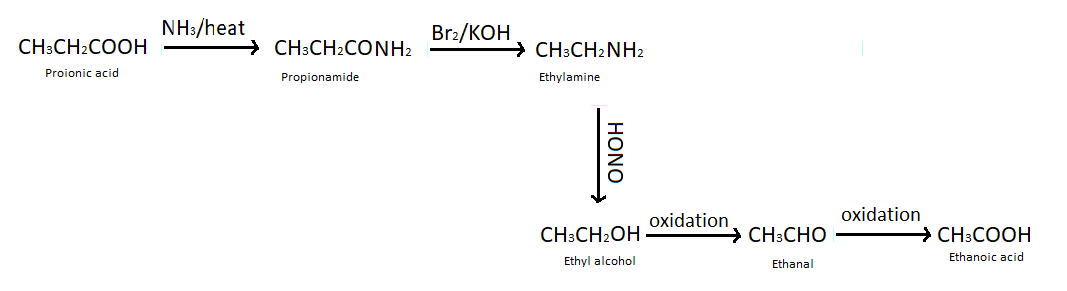 (b) Propanoic acid into ethanoic acid - To convert propanoic acid into ethanoic acid first of all we heat propanoic acid with ammonia which produces propenamide (an ammonium salt). Then we treat propenamide with bromine and aqueous or alcoholic $KOH$ which gives ethylamine, so here one carbon atom is reduced from the compound. This reaction is also known as Hoffmann bromamide degradation reaction. We have studied that when nitrous acid reacts with amine it produces alcohol so we have treated ethyl amine with nitrous acid. After all of these reactions by performing oxidation of ethyl alcohol we got ethanol and again doing oxidation reaction we got our desired product that is ethanoic acid.