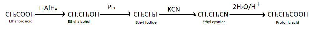 (a) Ethanoic acid into propanoic acid – We know that carboxylic acids can be converted into alcohols by treating them with lithium aluminium hydride, so here we have treated ethanoic acid with $LiAl{H_4}$ and got ethyl alcohol. When ethyl alcohol is treated with potassium iodide it produces ethyl iodide which further takes part in the reaction with potassium cyanide and produces ethyl cyanide. At last when ethyl cyanide reacts with ${H_2}O/{H^ + }$ it gives propanoic acid.