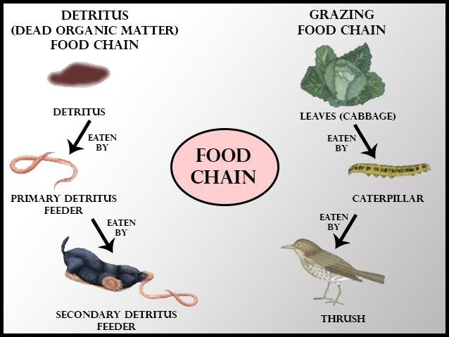 Detritus food chain – this food chain starts with dead organic matters. The food energy passes into decomposers and detritivores, which are further eaten by smaller organisms like carnivores.