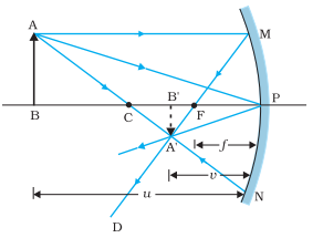 We now derive the mirror equation or the relation between the object distance (u), image distance (v) and the focal length (f). In the above figure, the two right-angled triangles A′B′F and MPF are similar.