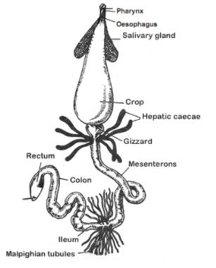 Mouth opens into the tubular pharynx leading to a narrow tubular passage called oesophagus, which in turn opens into a large pyriform sac in the crop. Food is stored in crops. The crop is followed by gizzard which helps in the grinding of food particle foregut is lined by cuticle.