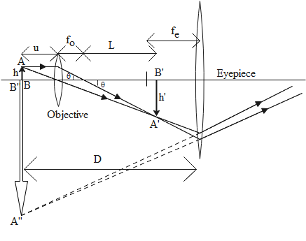 Note: In the final expression for magnification we notice that we have the focal lengths in the denominator. This implies that in order to obtain large magnification from the compound microscope, the focal lengths of the two lenses must be small.