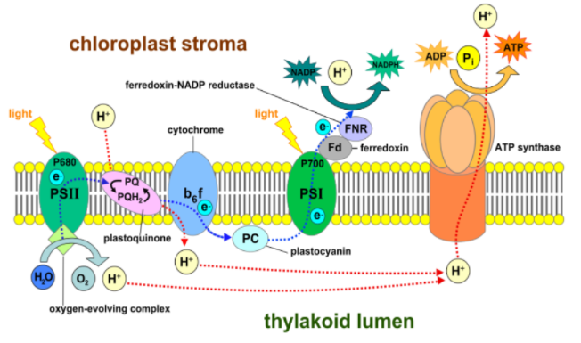 Describe the cyclic photophosphorylation? What is the purpose of the proton gradient during the process in thylakoids?