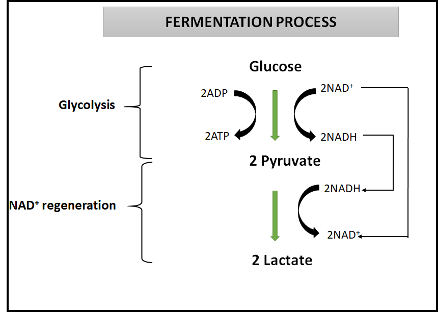 Fermentation is an enzyme-mediated energy liberating process in the absence or insufficient amounts of oxygen. This leads to the incomplete breakdown of the substrates and thus water is not produced as the end product in this process. The substrates which are usually carbohydrates after undergoing glycolysis and producing pyruvate takes a different turn. The lack of sufficient oxygen leads to the release of different products which may be lactic acid or ethyl alcohol.