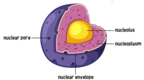A nucleus consists of nuclear membrane, chromosomes, nucleoplasm, and nucleolus.