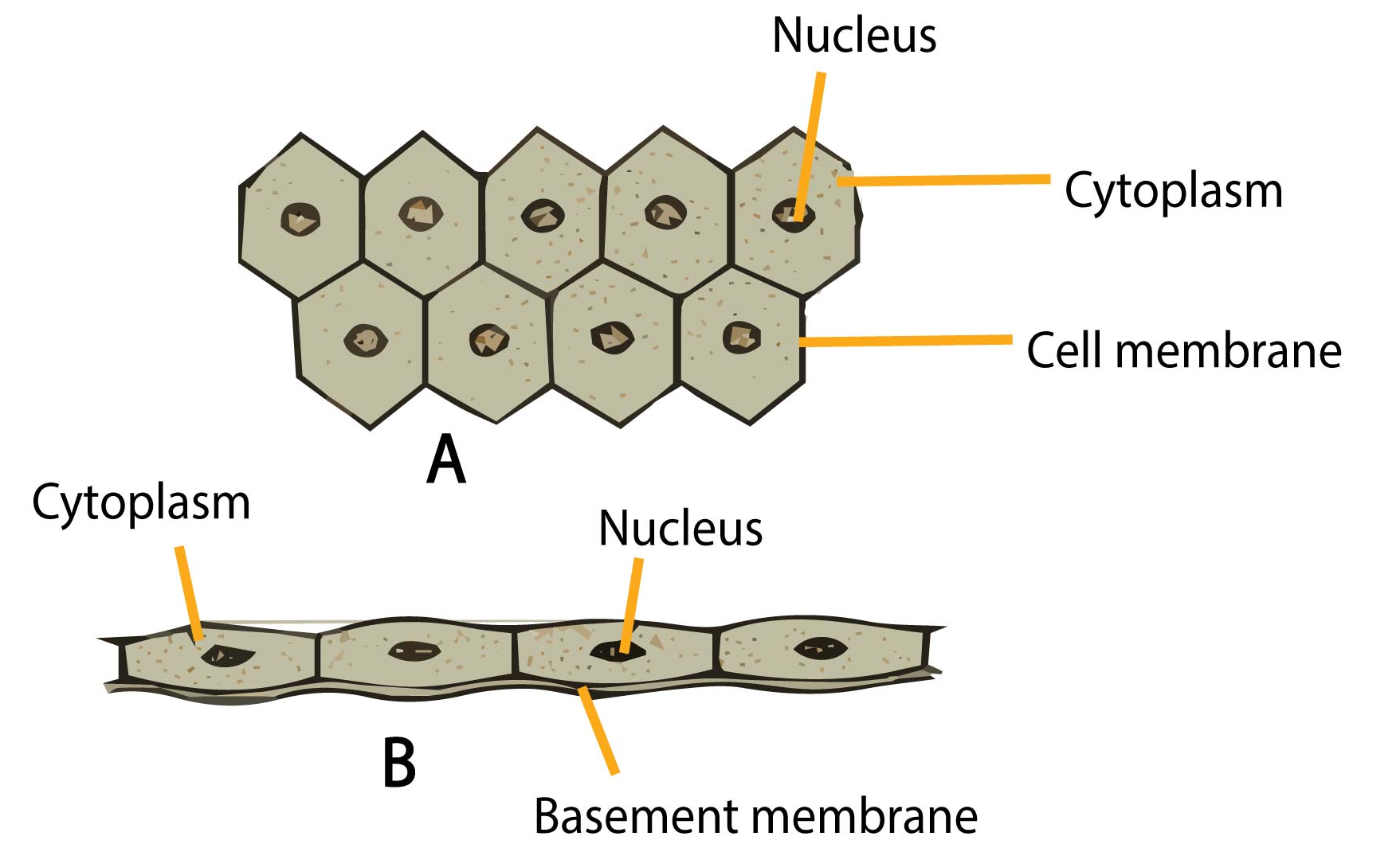 Squamous Epithelium: It is composed of a single layer of thin flattened cells hanging irregular boundaries. They are found to be having polygonal shapes. The nuclei of cells are flat and sometimes lie in the middle of cells.