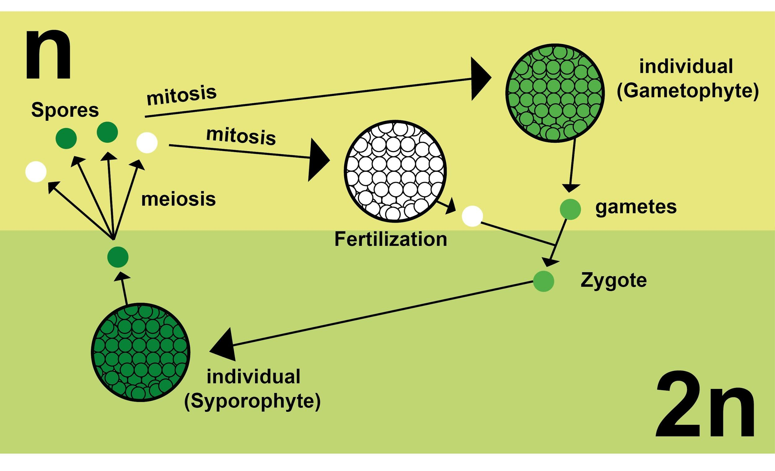 | Reproduction in the gametophyte stage takes place sexually. | Reproduction in the sporophyte stage takes place asexually. |