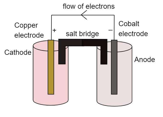 Hint: The galvanic cell is the common name of an electrochemical cell. Hence we will draw the electrochemical cell having electrodes of cobalt and copper. The oxidation will take place at the cobalt electrode, hence it will act as anode. Reduction will take place at copper electrodes, hence act as cathode. The flow of electric current will be opposite to the flow of electric current.