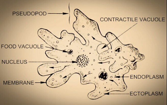 Amoeba: An amoeba, is a term generally used to describe a single-celled eukaryotic organism belonging to the kingdom Protista that has no definite shape and that moves by means of pseudopodia. Pseudopodia or pseudopods also known as the 'false feet' are temporary projections of the cell.