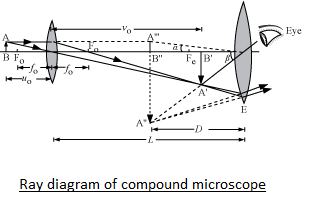 The course of rays through a compound microscopic is shown in the given figure. Here we can see that an image is formed at the least distance of distinct vision from eyes. Here, AB ia a tiny object held perpendicular to the common principal axis, in front of the objective lens beyond its focus. A real and inverted and enlarged image A’B’ of this object is formed by the objective lens which in turn acts as an object for the eye lens, whose position is adjusted so that the A’B’ lies between its optical centre and focus. A virtual and magnified image A”B” is formed by the eye lens. This image is erect with respect to A’B’ but is inverted with respect to AB.