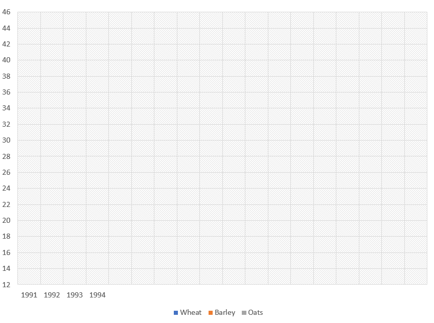 Years Wheat Barley Oats 1991 34 18 27 1992 43 14 24 1993 43 16 27 1994 45 13 34