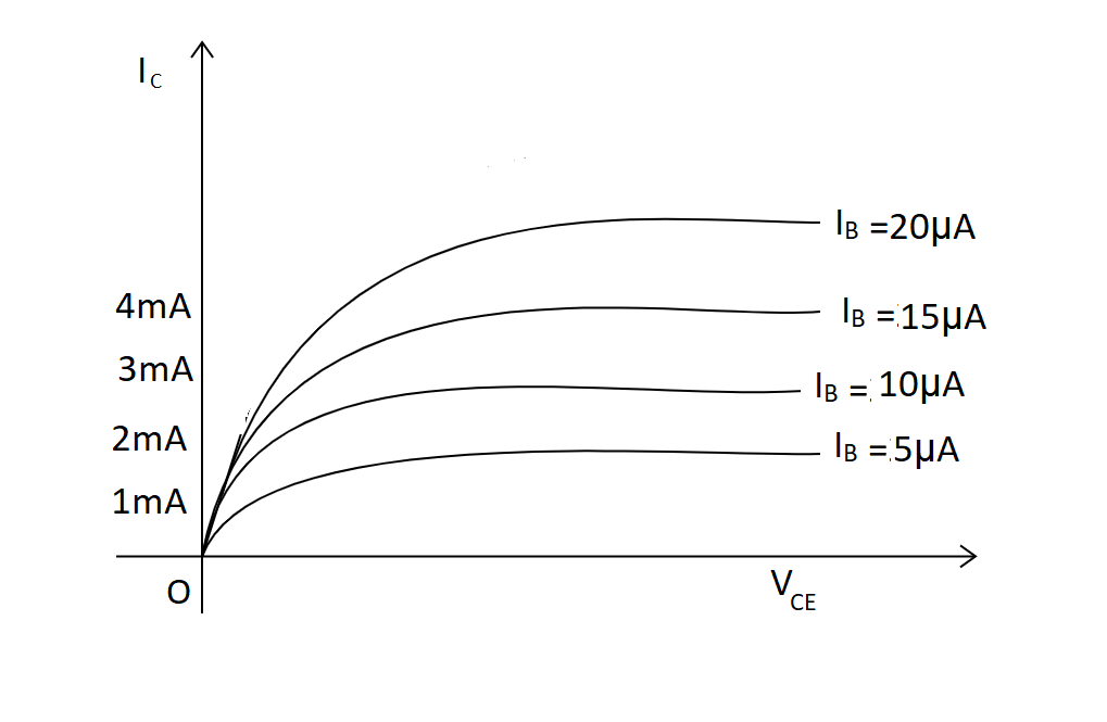 A graph is plotted with collector current ${I_C}$ along Y-axis and collector emitter voltage ${V_{CE}}$ along X-axis keeping ${I_B}$ constant. The procedure is repeated for different values of ${I_B}$. A family of output characteristic curves is obtained as shown.