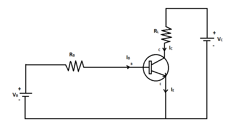 Here the base and the collector are connected to the positive terminals of the cell and the emitter is connected to the negative terminal of the cell. The electrons from the emitter flow towards the base resulting in an emitter current ${I_E}$. As the base is lightly doped and very thin, a few electrons combine with holes at the base. For every hole neutralized, an electron enters the positive terminal of the battery. This constitutes the base current ${I_B}$. The balanced electrons cross the base region and reach the collector region. These electrons move to the positive of the battery ${V_C}$. This constitutes the collector current ${I_C}$. Thus the emitter current is the sum of collector current and base current.