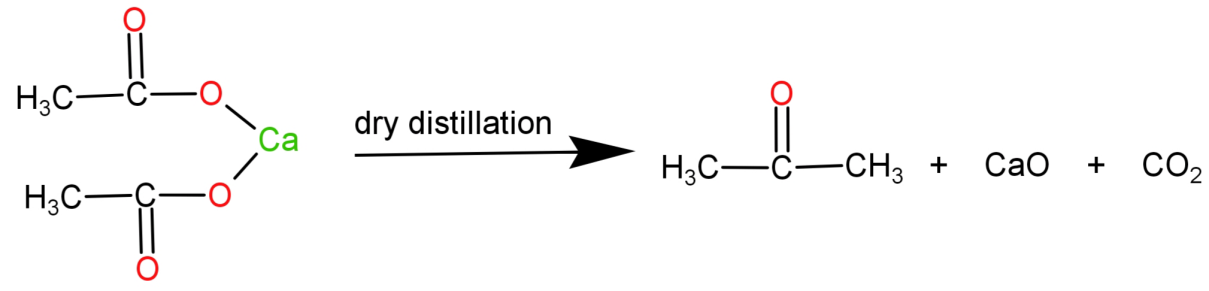 -Calcium acetate: It is a calcium salt of acetic acid. It’s molecular formula is: ${(C{H_3}COO)_2}Ca$. It undergoes dry distillation to form acetone ($C{H_3}COC{H_3}$ ).