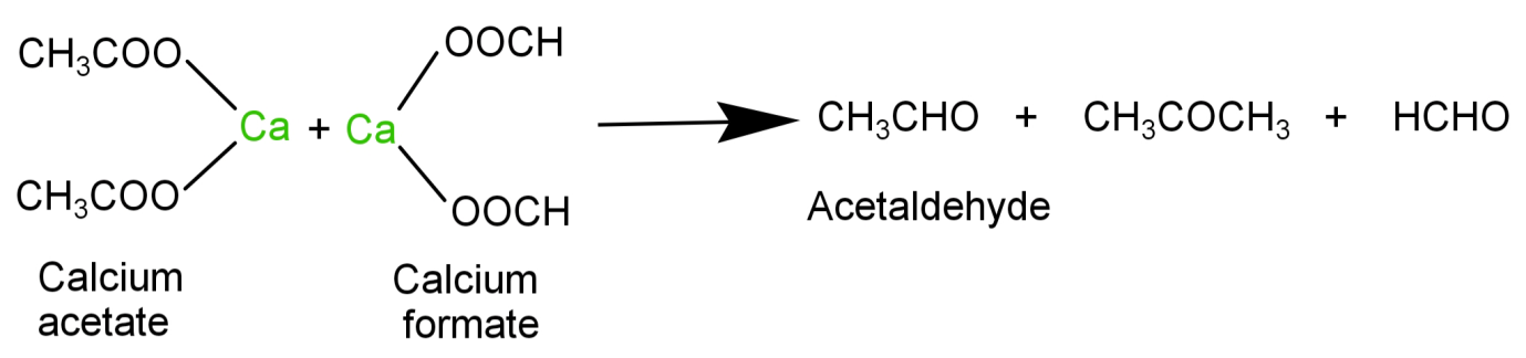 Note: Sometimes we think that only the 2 products which are formed during the separate dry distillations of calcium acetate and calcium formate will be formed during the dry distillation of the mixture. So, remember that these 2 salts together produce a mixed product acetaldehyde also.