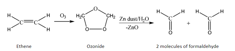 Hence, it can be concluded that ethene undergoes oxidative double bond cleavage when allowed to react with ozone and produces two molecules of formaldehyde.