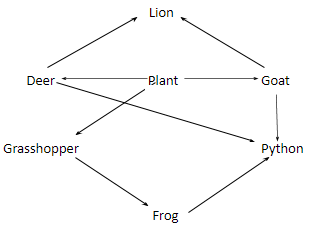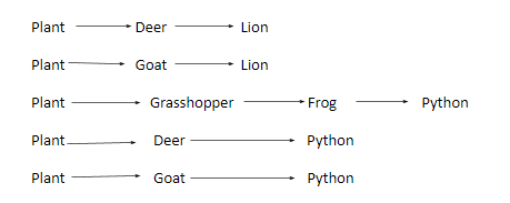 A food chain depicts a linear relationship between the producers, consumers, and the decomposers in an ecosystem. In a food chain, each biotic element is assigned a trophic level which basically is the organism’s position in the food chain. Producers (plants, phytoplankton) i.e. the organism that can produce its own food is placed in the first trophic level. Primary consumers occupy the next trophic level. Primary consumers feed on the producers (deer, grasshopper). The secondary consumers (frog, python, and lion) occupy the next trophic level. The tertiary consumers (lion, python) who feed on the secondary consumers occupy the next trophic level. This is an example of a grazing food chain. Most of the food chains are short but depending upon the ecosystem the number of trophic levels varies.