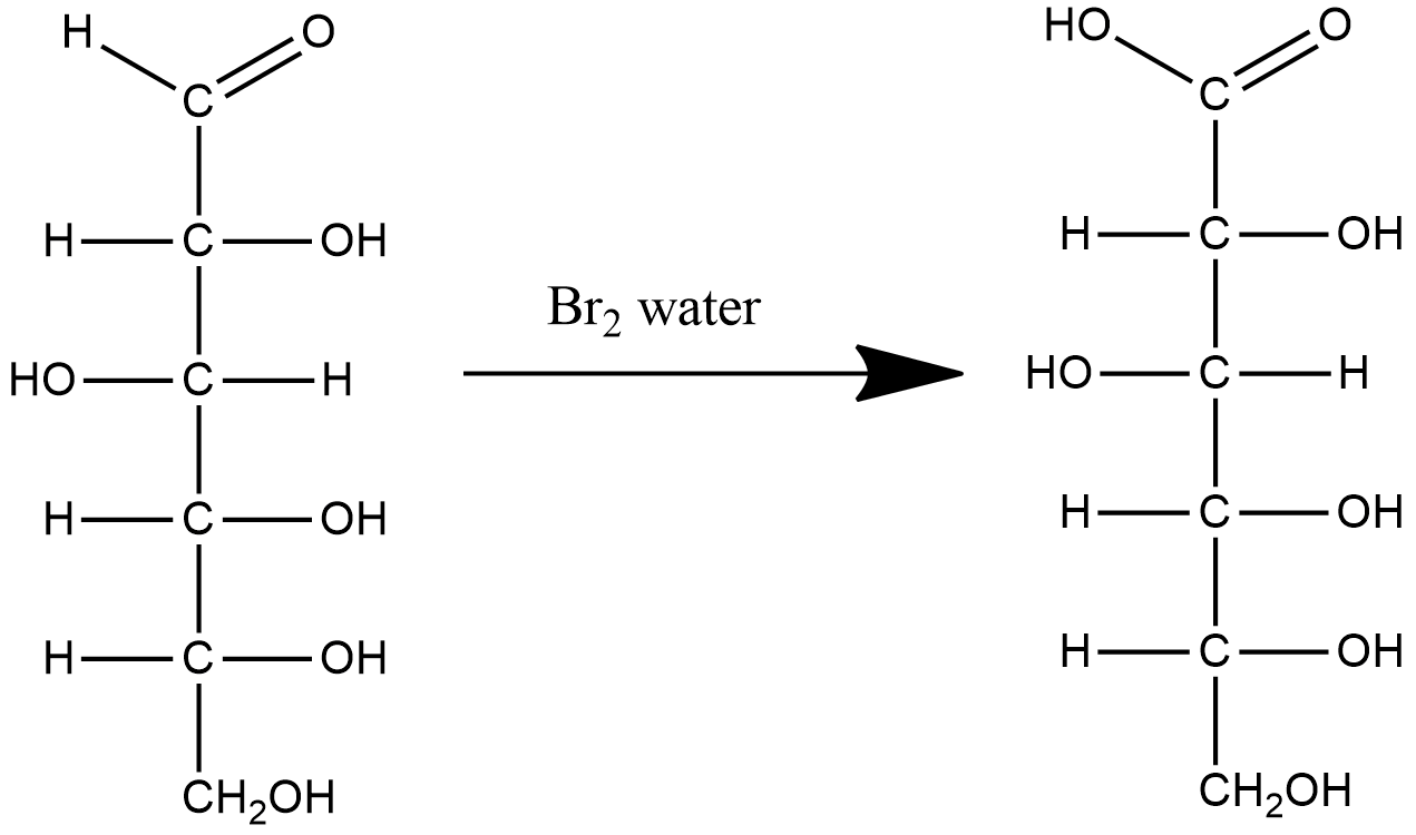 Hint: The Fischer projection of glucose molecule reveals that there is an aldehyde group at one of the ends which can be easily oxidized. On the other hand, $B{{r}_{2}}$water is considered as a mild oxidizing agent that can oxidize aldehyde groups to carboxylic acid.