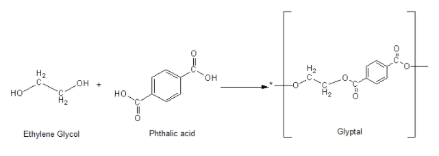 The structure of Glyptal is made up of two monomers Ethylene glycol and Phthalic acid as shown in the Reaction.