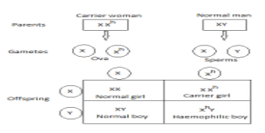 Haemophilia is a X-linked recessive disorder and shows its transmission from normal carrier female (heterozygous) to male progeny. There is a presence of defective form of blood clotting factor due to which blood fails to coagulate. The person suffering from this disease cannot synthesize a normal blood protein called antihemophilic globulin (AHG) required for blood clotting.