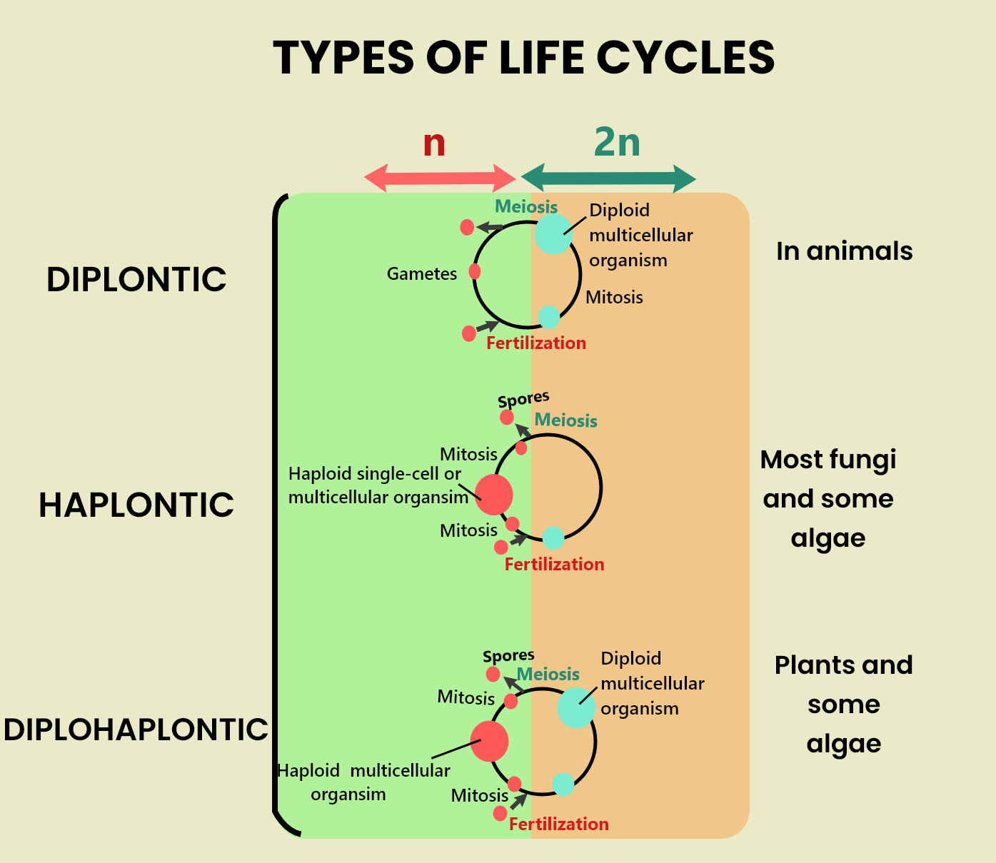 Note: Life cycles involving sexual reproduction require alternating phases of haploid (n) and diploid (2n), i.e. a ploidy transition is involved. Meiosis must occur to return from a diploid phase to a haploid phase. There are 3 types of cycles with respect to shifts in ploidy: haplontic, diplontic, and diplohaplontic life cycles.